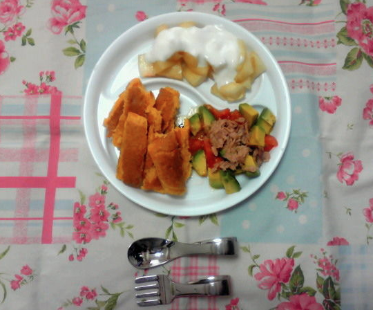☆ホットケーキ、アボカドとトマトのツナサラダ、初☆桃のヨーグルトかけ