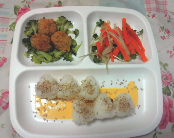 ☆キャベツの肉団子トマト添え、桃、ゴマおにぎり