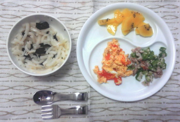 ☆のりうどん、オクラと豚、トマトの炒り卵、キウイ