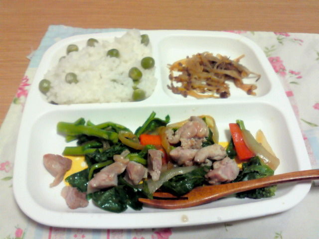 ☆鶏肉と菜の花の炒め物、豆ご飯、もやしそぼろ