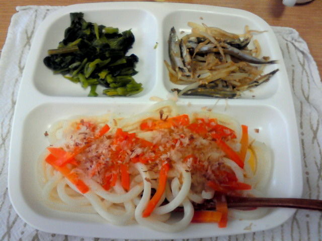 ☆人参うどん、ほうれん草、小魚とモヤシの炒め物