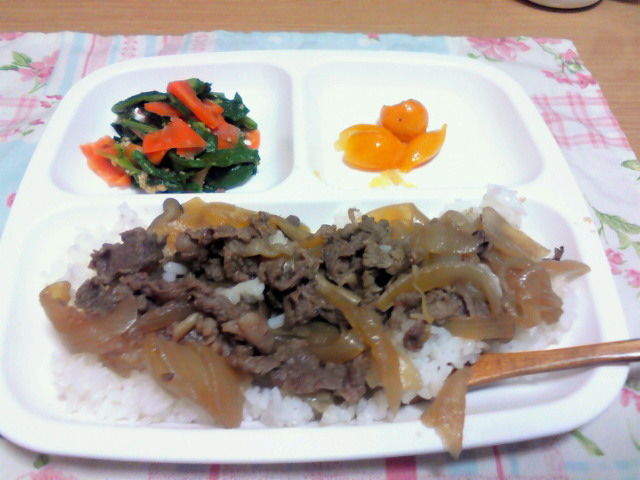 ☆牛丼、なばなと人参の胡麻みそ和え、きんかん