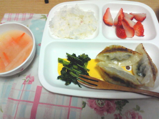 ☆餃子、なばなの炒め物、お味噌汁、いちご