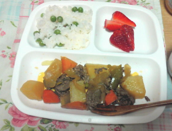 肉じゃが(ジャガイモ人参玉ねぎスナックエンドウ牛肉)、豆ご飯、撮り忘れたなめこの味噌汁、いちご