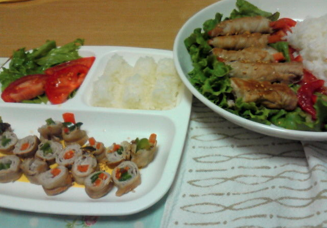 肉巻き(豚肉人参ピーマンしめじ)、サラダ(グリーンレタス、トマト)